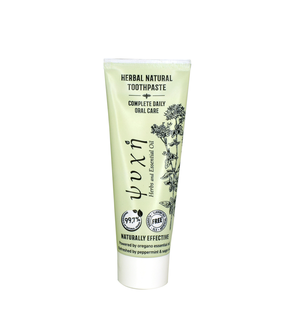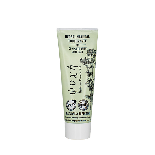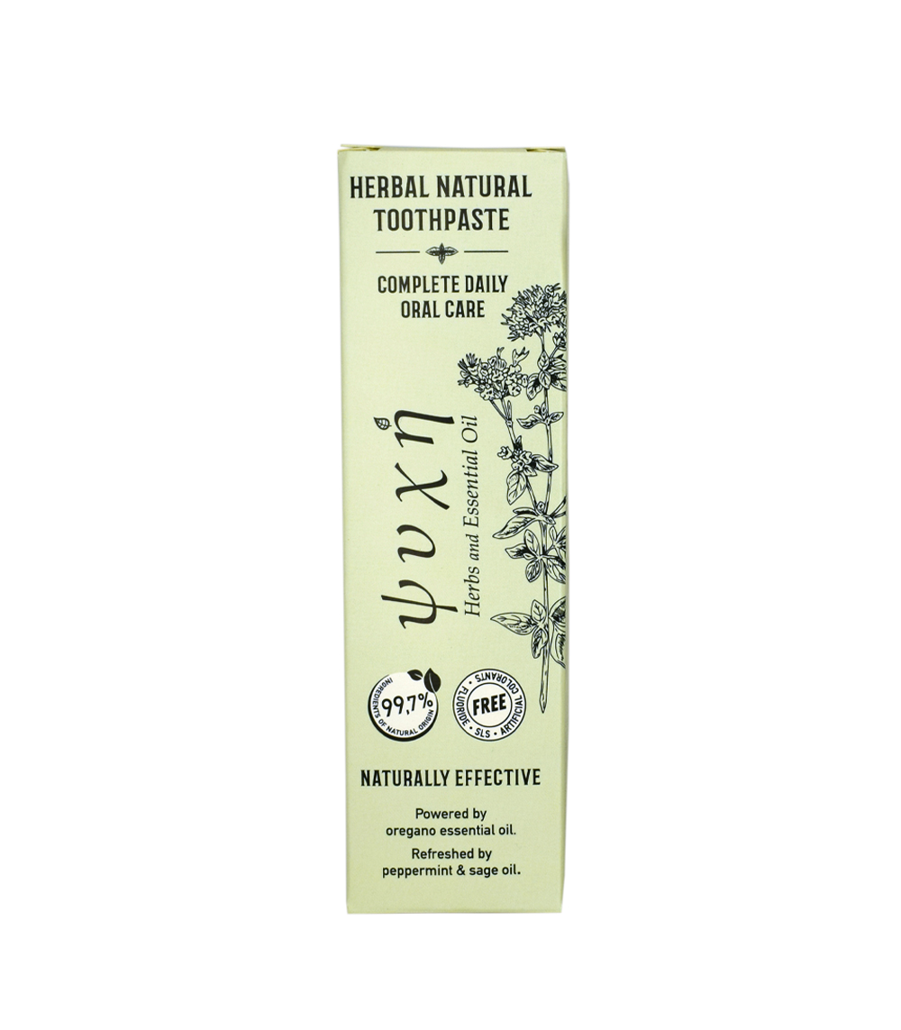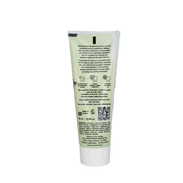 Οδοντόκρεμα καθημερινής χρήσης, φυσικής προέλευσης, με αιθέρια έλαια ρίγανης , δυόσμου & φασκόμηλου.